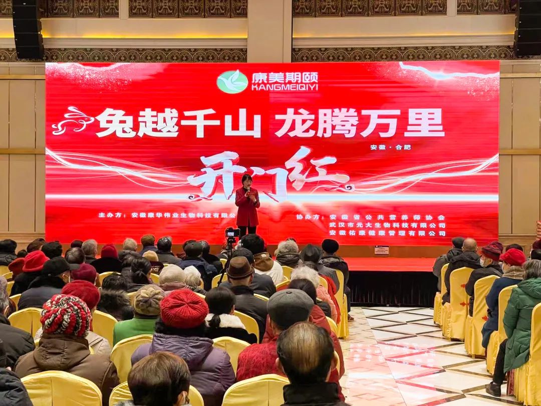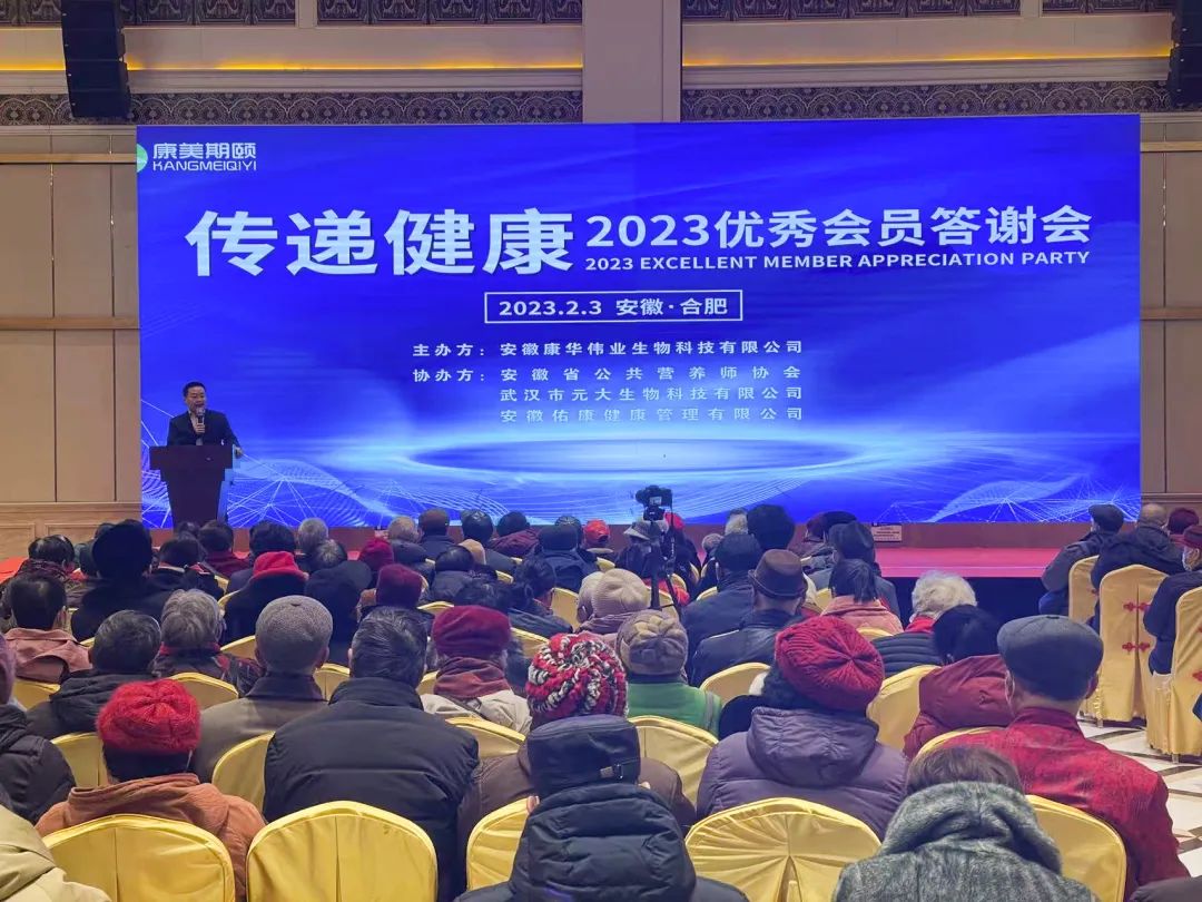 回首过去峥嵘岁月,感恩一路有您!展望未来,锦绣前程,携手同创共赢。2月3日上午,安徽康华伟业生物科技有限公司在合肥杏香园酒店现场举办了2023·共享免疫优秀会员答谢会。宴会分为“新春开门红”、“共享免疫 传递健康 快乐人生”和“精彩演出 感恩有你”三部分。数百名康华会员受邀参加,一起迎接美好2023的到来!此次活动由安徽省康华伟业生物科技有限公司主办,安徽省公共营养师协会、武汉元大生物科技有限公司和安徽佑康健康管理有限公司协办,在此表示深深的感谢!